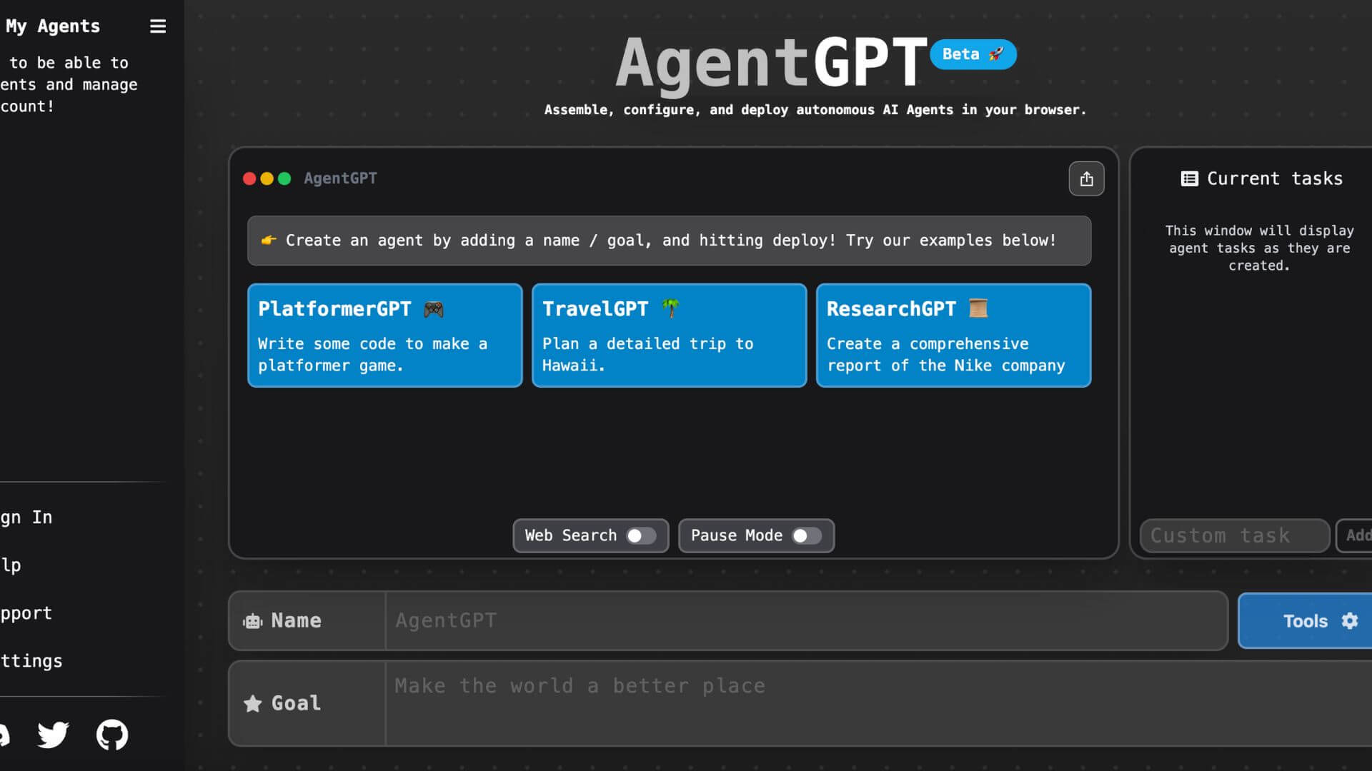 AgentGPT is a tool that allows users to create and deploy autonomous AI agents in their browser. It provides a simple interface to assemble and configure agents by providing a name and goal, and then deploying them. It also allows users to provide their own OpenAI API key in the settings tab for increased limits.