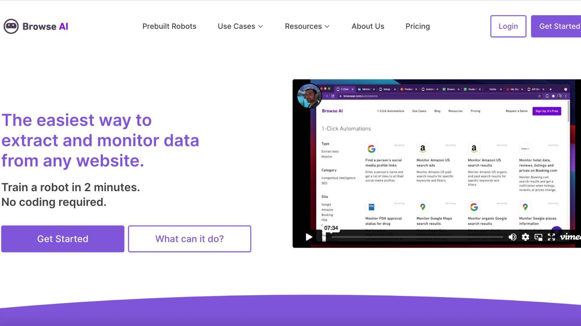 Browse AI is a web automation service that enables users to extract and monitor data from any website. With no coding required, users can set up a robot in just two minutes and use prebuilt robots for popular use cases. The service offers features such as data extraction, monitoring, pagination and scroll handling, scheduling, and flexible pricing.