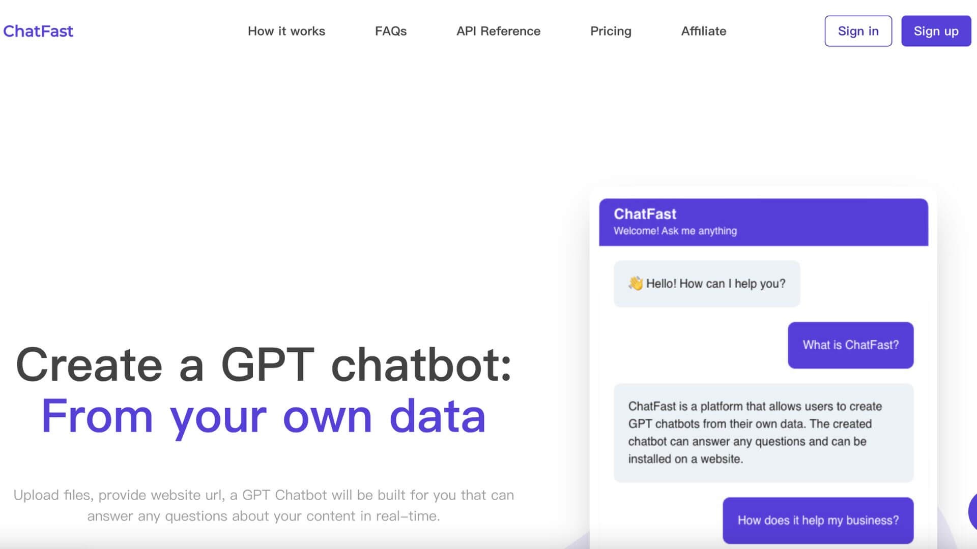 ChatFast is a platform that allows users to create GPT chatbots from their own data. The chatbot can answer questions about the data and can be embedded on a website. The platform supports plain text, PDFs, website URLs, scanned PDFs, and images with text. It can understand and help in 50+ different languages. API access is available for paid plans.