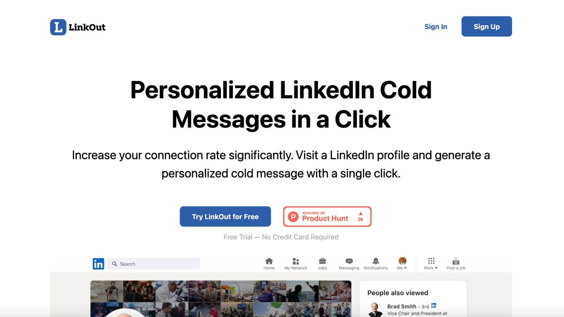 LinkOut is an automated tool that helps users to generate personalized cold messages for their LinkedIn connections. It helps users save time by quickly generating custom messages without compromising on quality, and it has been shown to increase connection rates significantly. LinkOut also offers examples of improved messages.