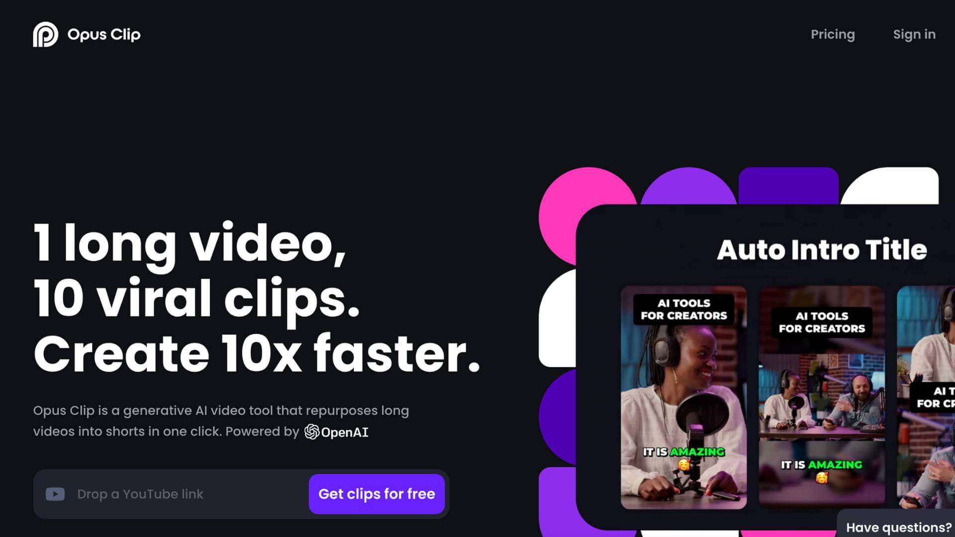 Opus Clip is a tool that helps video creators repurpose their long videos into professional short clips to increase their reach and monetization potential on platforms such as YouTube Shorts, TikTok, and Instagram Reels. It uses AI-powered technology to automatically trim and resize videos, add captions, and edit them in the Alex Hormozi style. It also includes features such as AI curation, AI face detection, AI highlight, auto transition, video cropping, auto caption, auto emoji, and an AI viral score.
