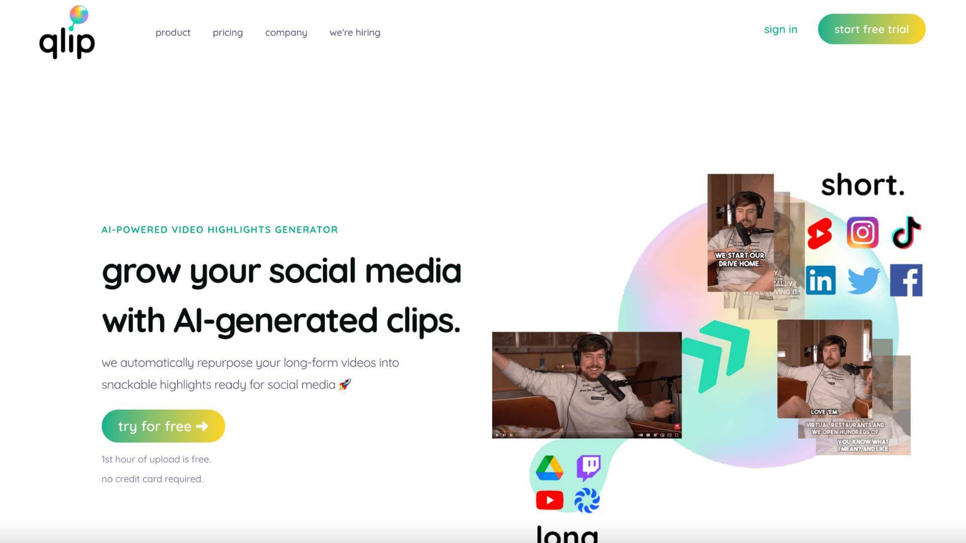 Qlip is an AI-powered video highlights generator that helps content creators repurpose long-form videos into shorter, more shareable clips for social media. It features a machine learning model that automatically recommends highlights, a templated video generator, and options to post clips on social media, embed them on websites, or link them on emails and SMS. Qlip offers plans with varying amounts of storage space and upload time, with the first hour of upload being free.