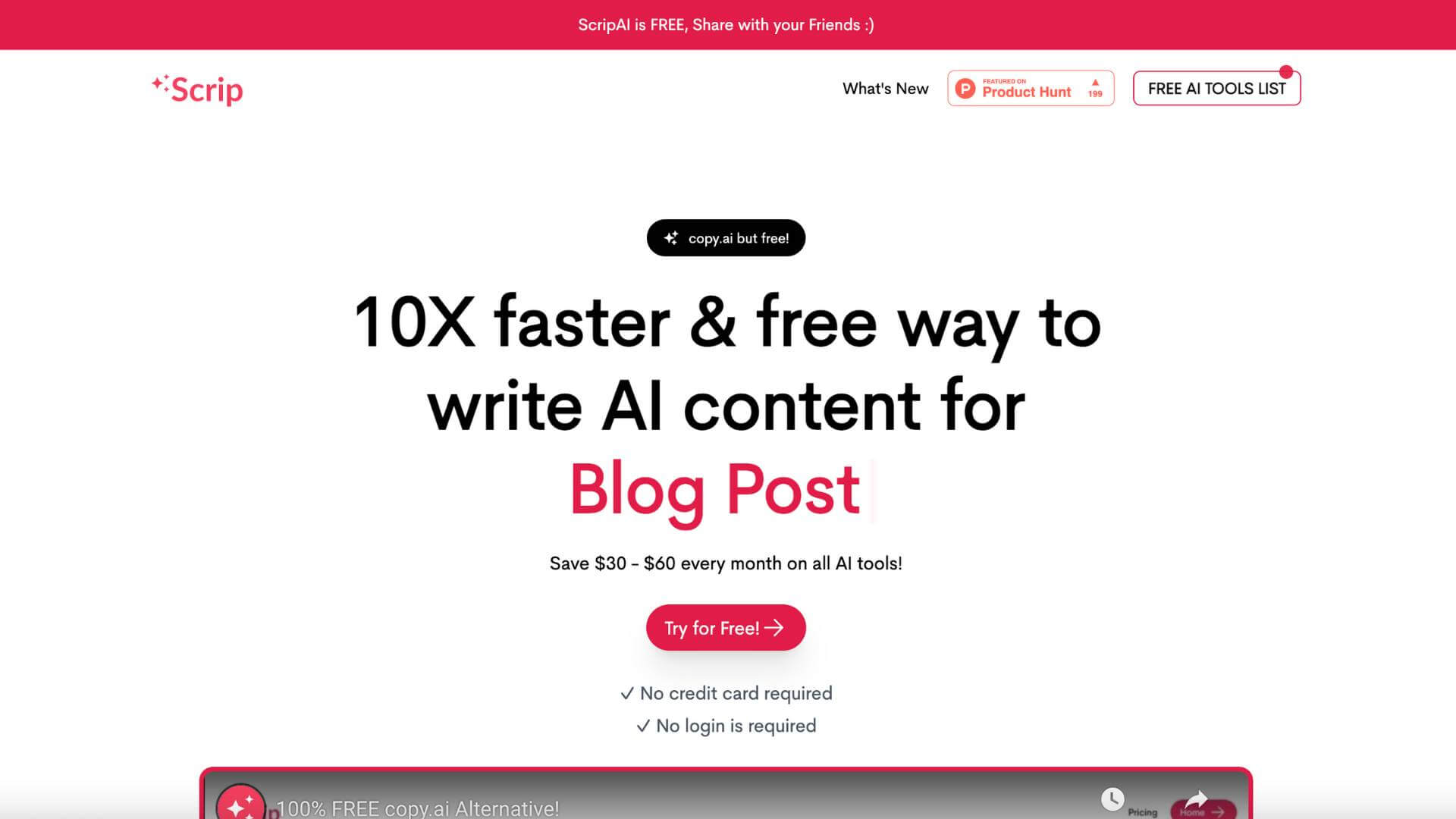 Scrip AI tool provides a 10X faster way to write short video scripts for Instagram. It allows users to create scripts for videos that are 30-60 seconds in length in only 1 minute. It is free to use and does not require a credit card or login.