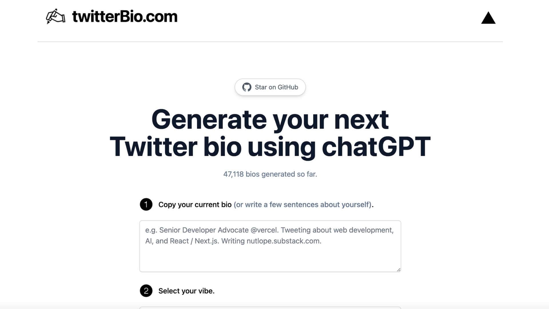 This tool generates a Twitter bio based on the user's current bio (or a few sentences they provide) and their chosen vibe (Professional, Casual, or Funny). It quickly creates a customized, optimized bio to help users make a great impression on Twitter.