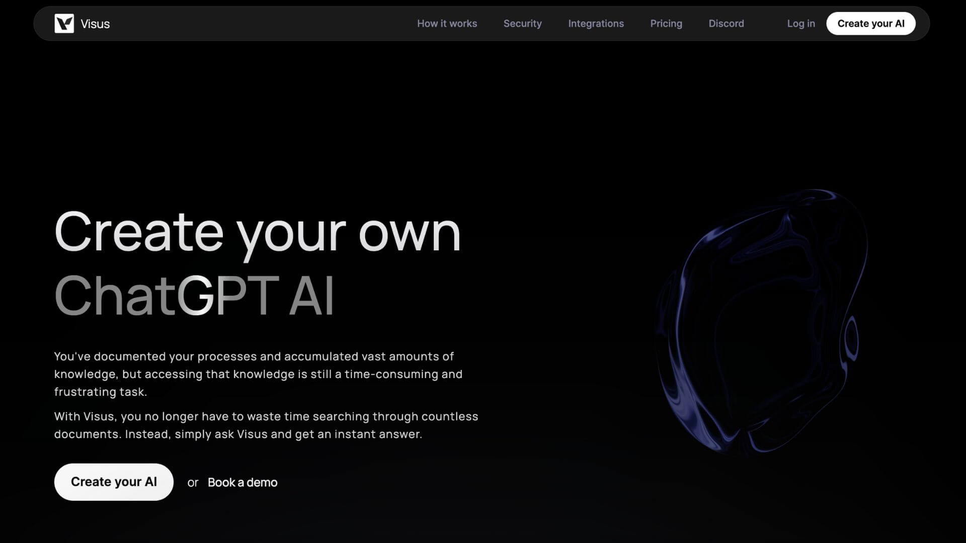 Visus allows you to train a ChatGPT AI on your documents and knowledge base. Uncover valuable insights from your data quickly and effortlessly. Visus.ai understands your language and learns from your documents, delivering personalized results tailored to your specific needs.